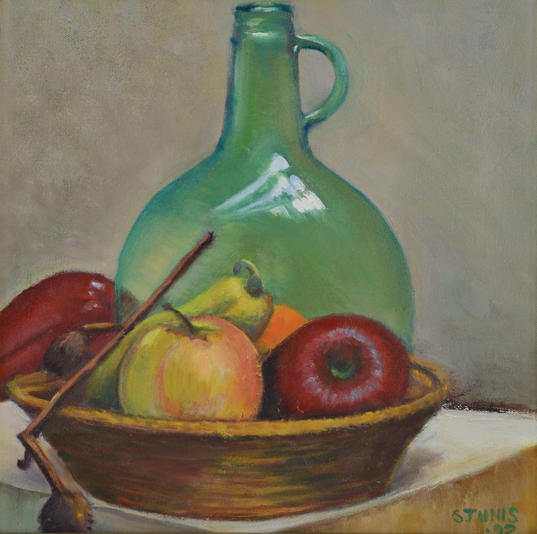 Lovely and incredible transparent green glass jug with fruit. Painting from 1992, measures 12" x 12".
