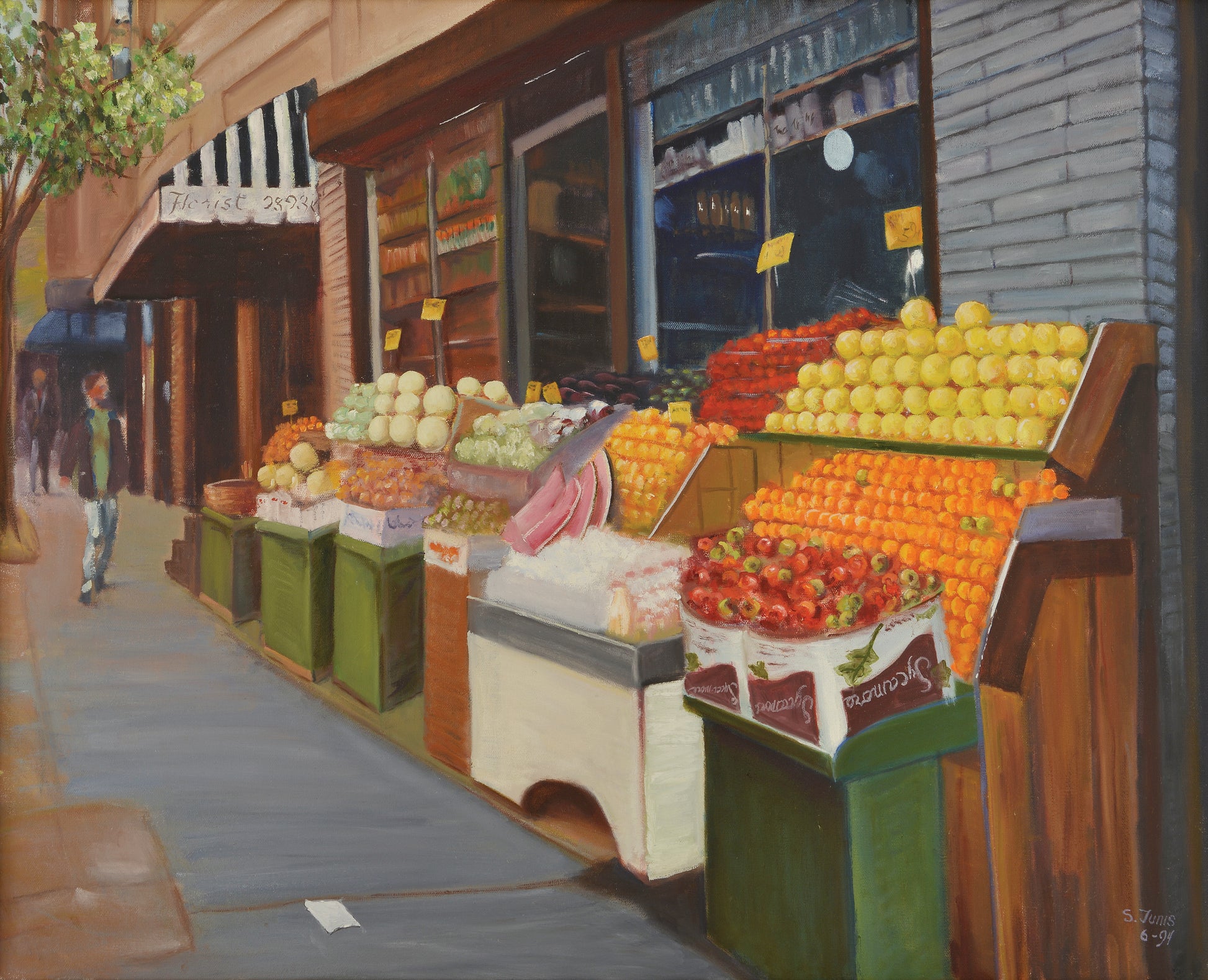 This bright, detailed oil painting portrayal of an abundant fruit stand on Madison Avenue is so colorful, almost fragrant to behold and provides whimsey too. Painted in 6/1994 during summer, the artist who had indicated that she put humor in her paintings, did so here! There is a piece of paper on the sidewalk! 30" x 24" framed.