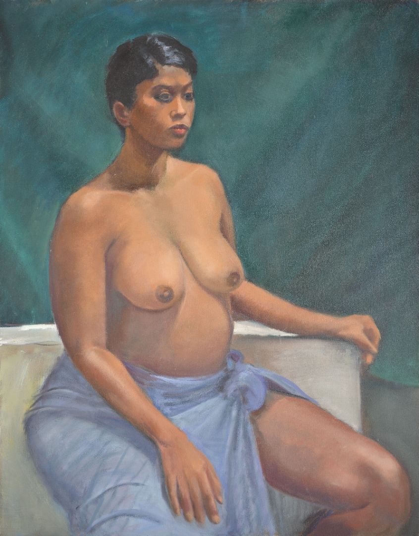 28" x 24" painted 2000, this painting is reminiscent of Paul Gaugain's style, "Synthetist" of modern art with the expression of meaning of the subjects in his paintings which was quite primitive-and differs from Impressionist art. Gaugin was a leading Post-Impressionist painter.