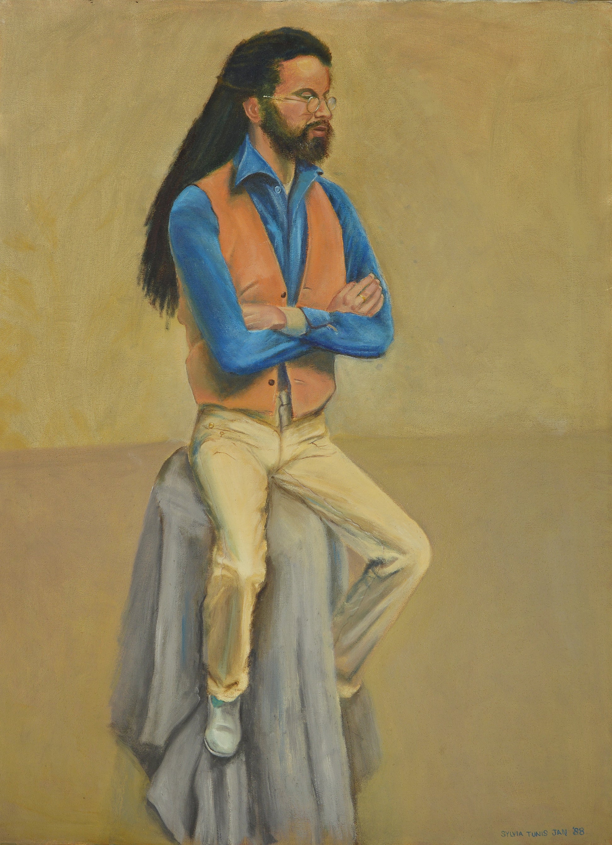 Very cool looking young man sitting on a draped stool. Painted 1988. 18" x 24".