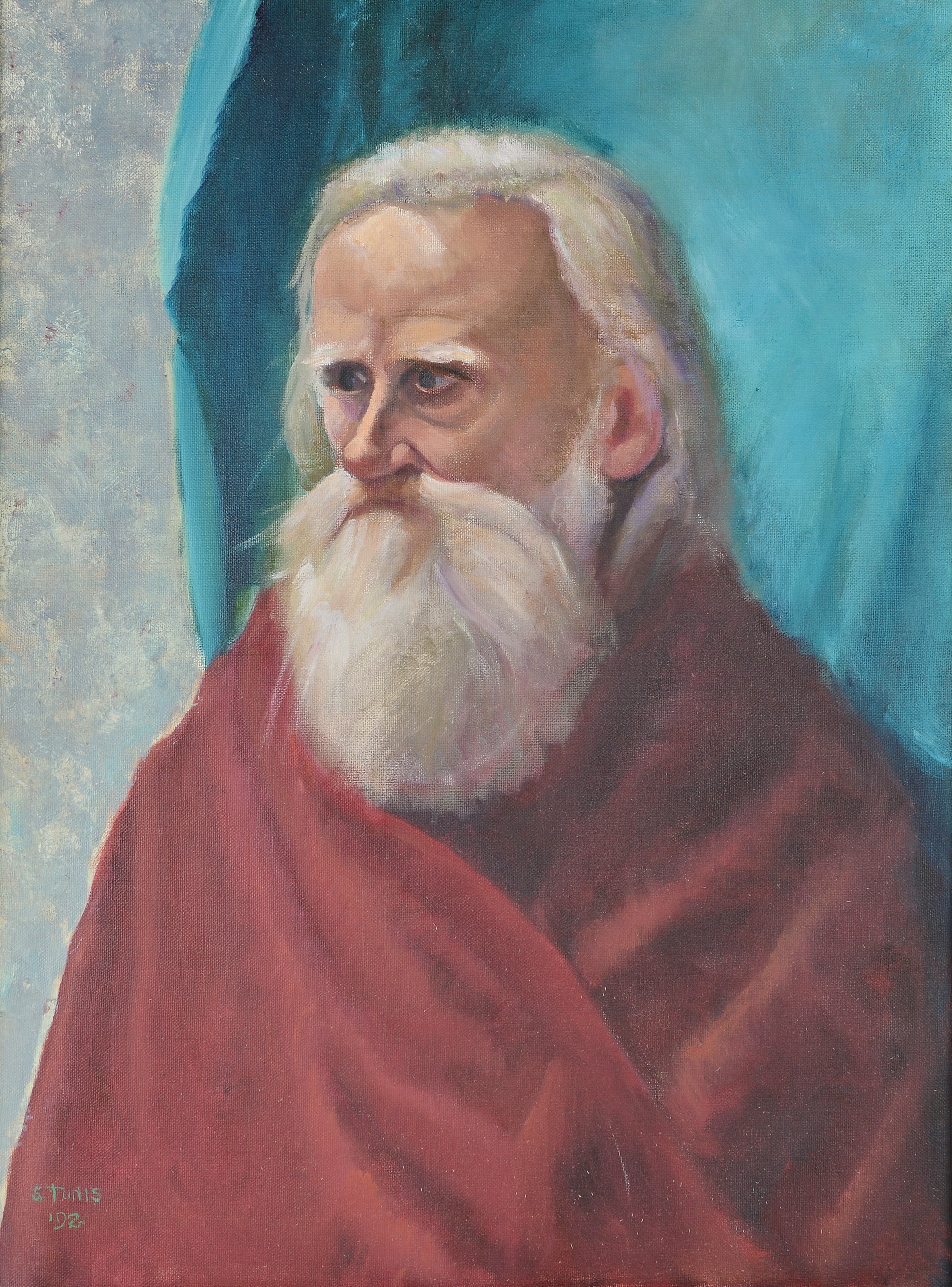Painting, done in 1992 represents an older male with a white beard. 18" x 24"