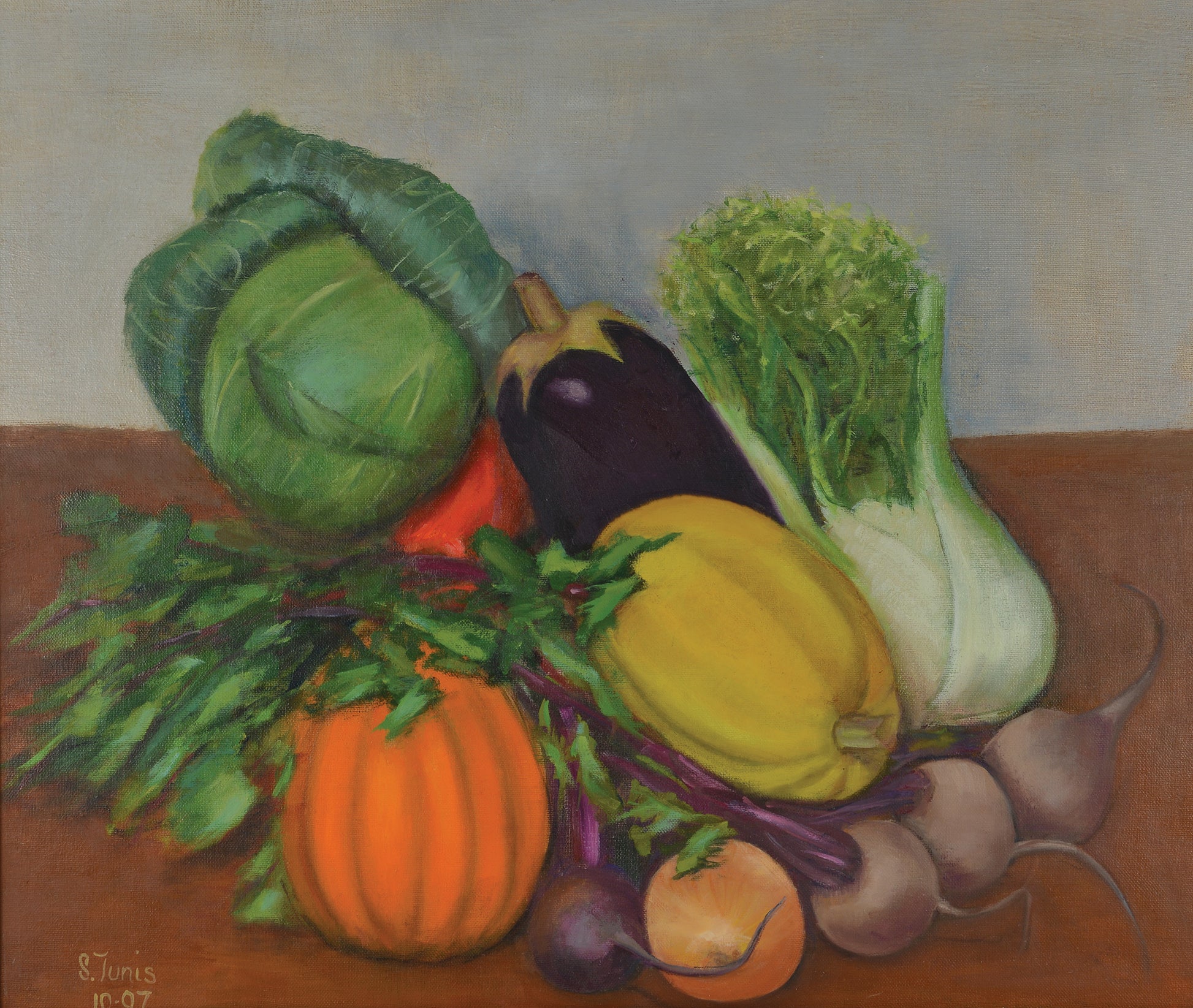 This cornucopia of glorious, brightly colored, beautiful root vegetables is so lush you can just taste and smell them. Painted in 1997, this painting is gold framed. 20" x 24".