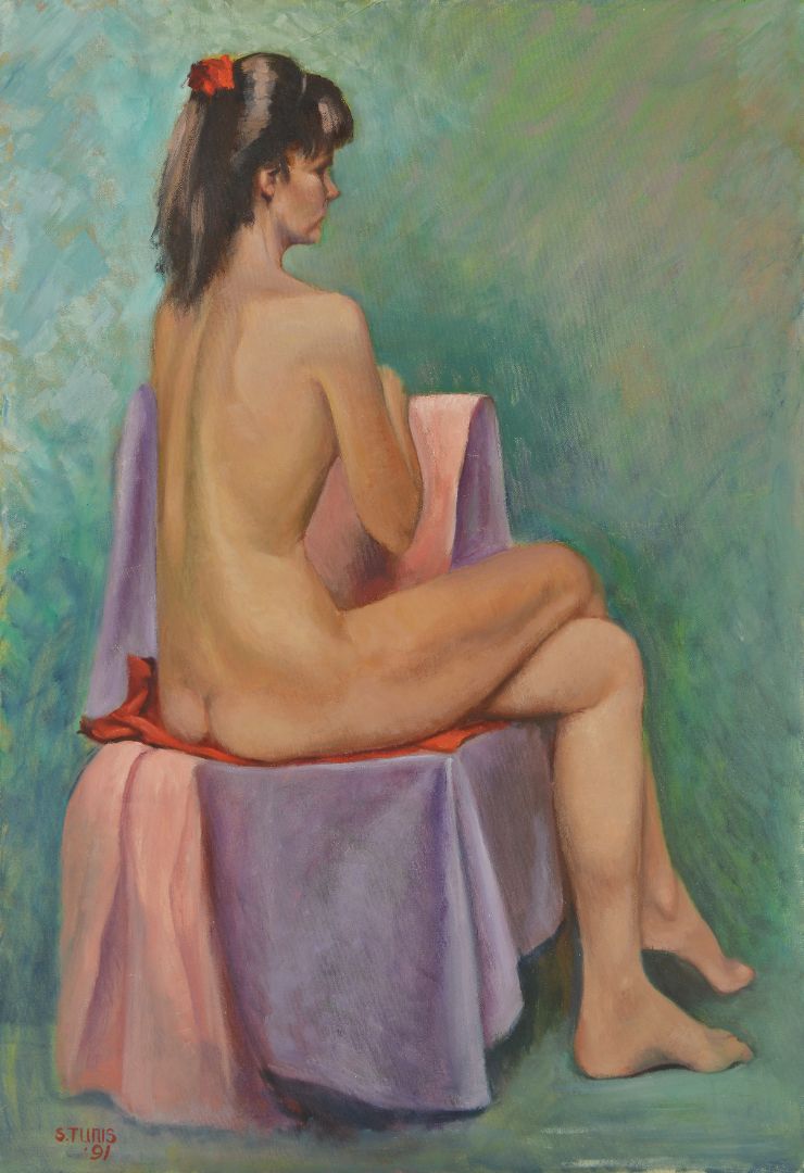 Beautiful painting of a nude woman from the back, seated, painted in 1991.