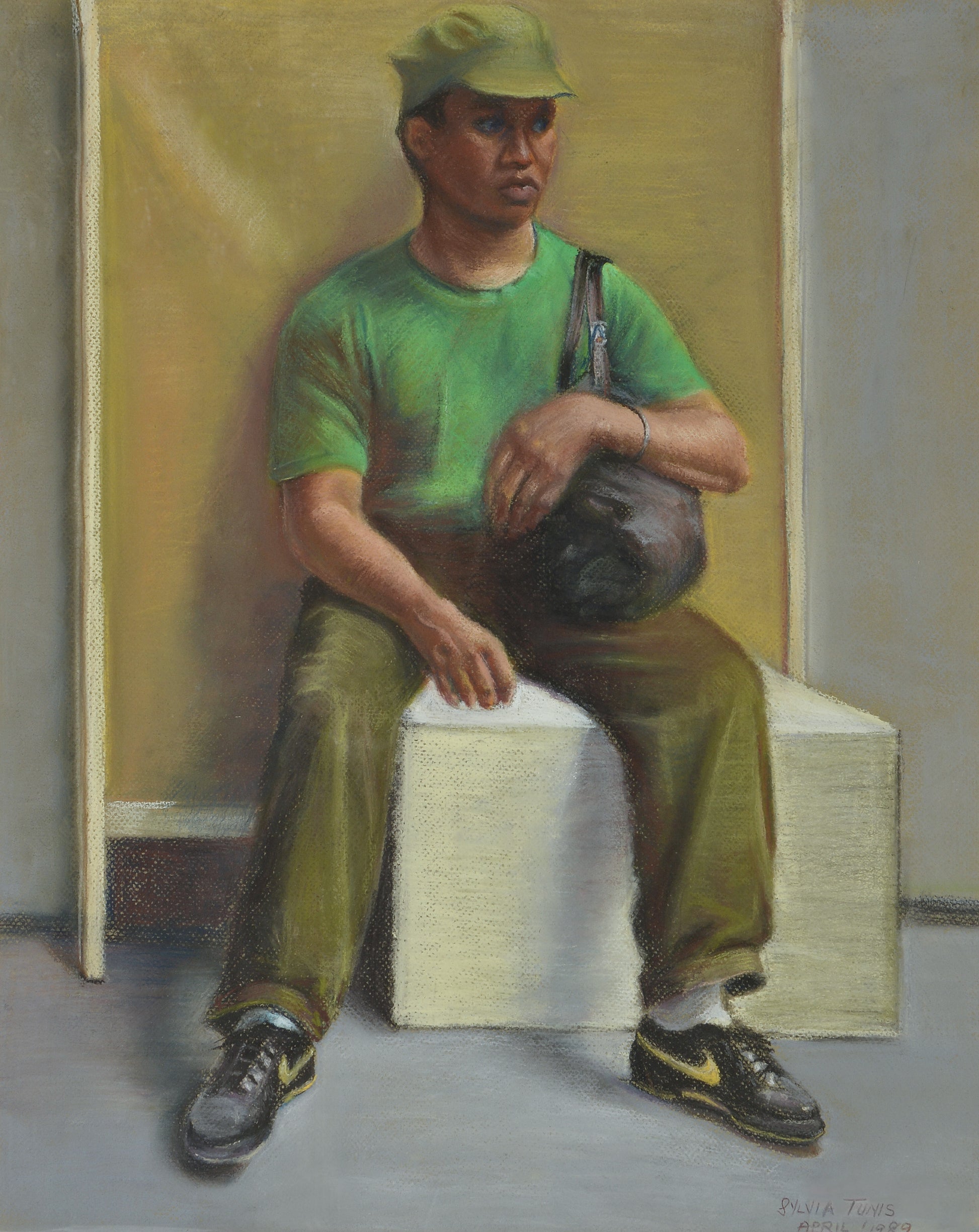 Beautiful green hues and the way the fabric falls is sheer magnificence. This was done over 30 years ago in 1992. 20" x 24". Nike has the same logo!