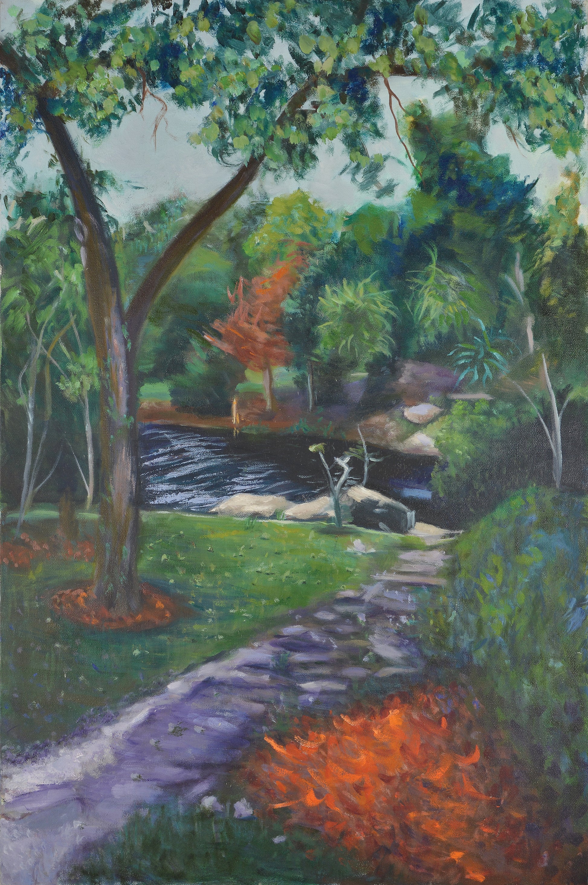 Colorful painting, with a modern and Asian feel or influence, this oil from 2/93 is one of a kind.