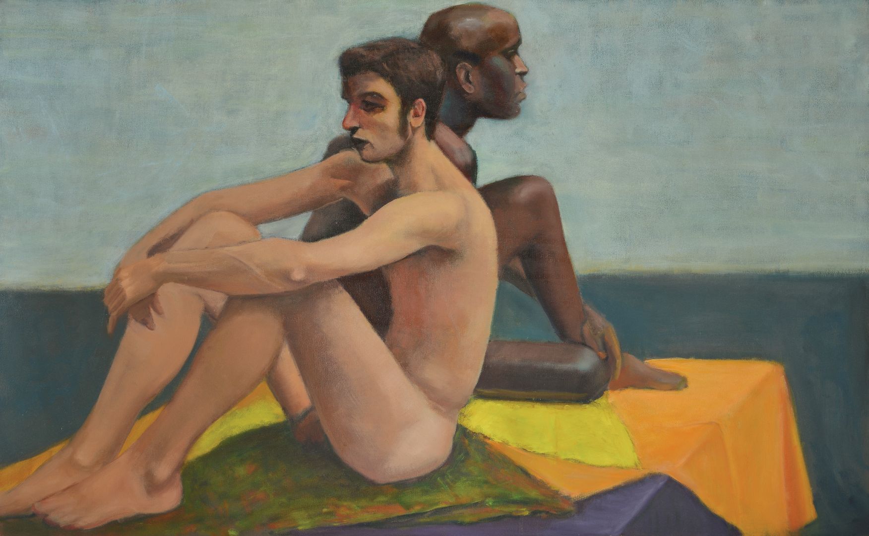 Painting done in 1995 portrays two men seated side by side not interacting with each other. 24" x 20".
