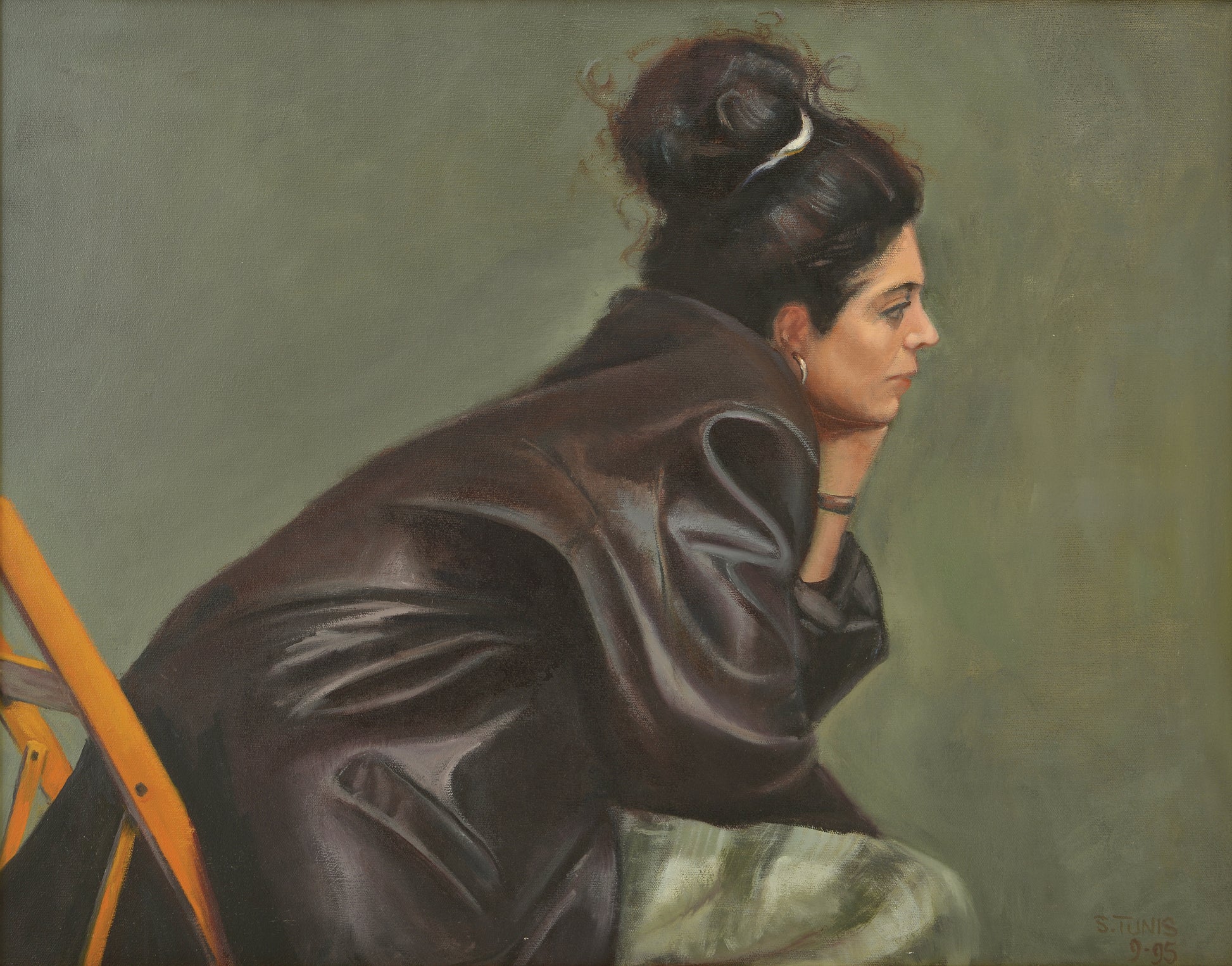 Within this fantastic painting one can actually 'feel' the leather, the folds, etc.. Possibly inspired by artist Sylvia Tunis classes with the late Serge Hollerbach who studied and mastered the art of bringing clothing folds to look real during his work doing portraits during WW11. Magnificent piece. 1995, 28" x 22".
