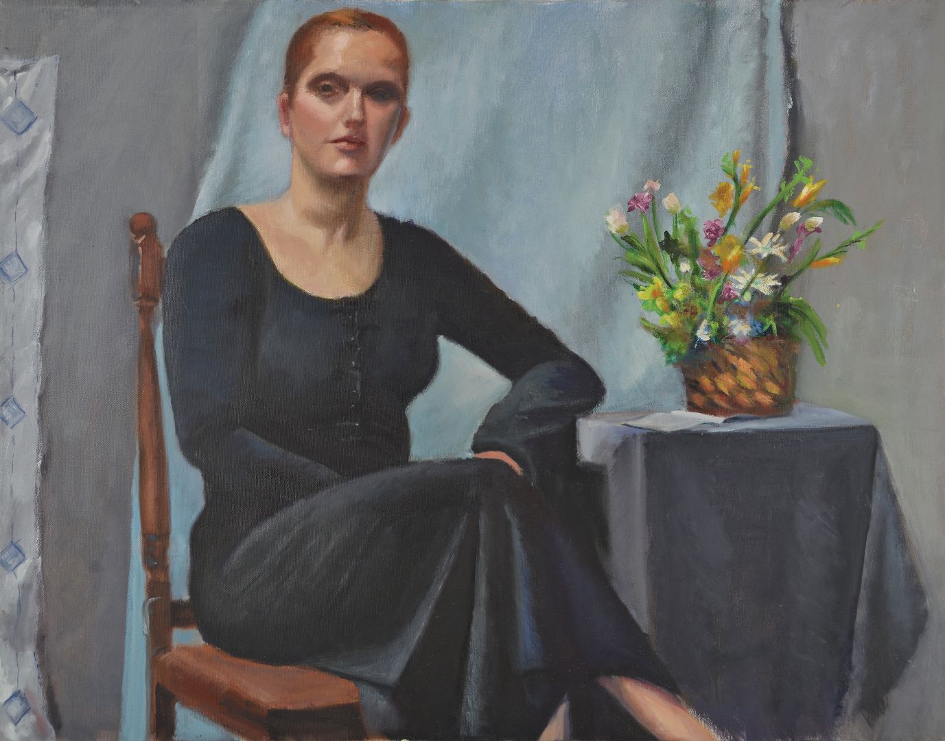 Powerful painting of woman in charcoal outfit, 22" x 28"
