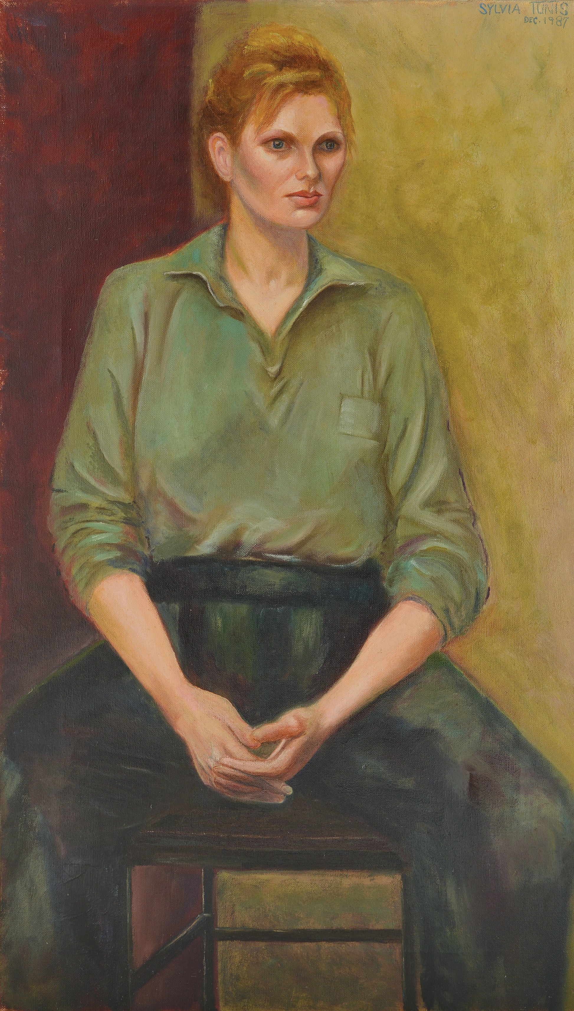 Autumnal hues adorn this work, of a seated women in work type clothing, 1987.