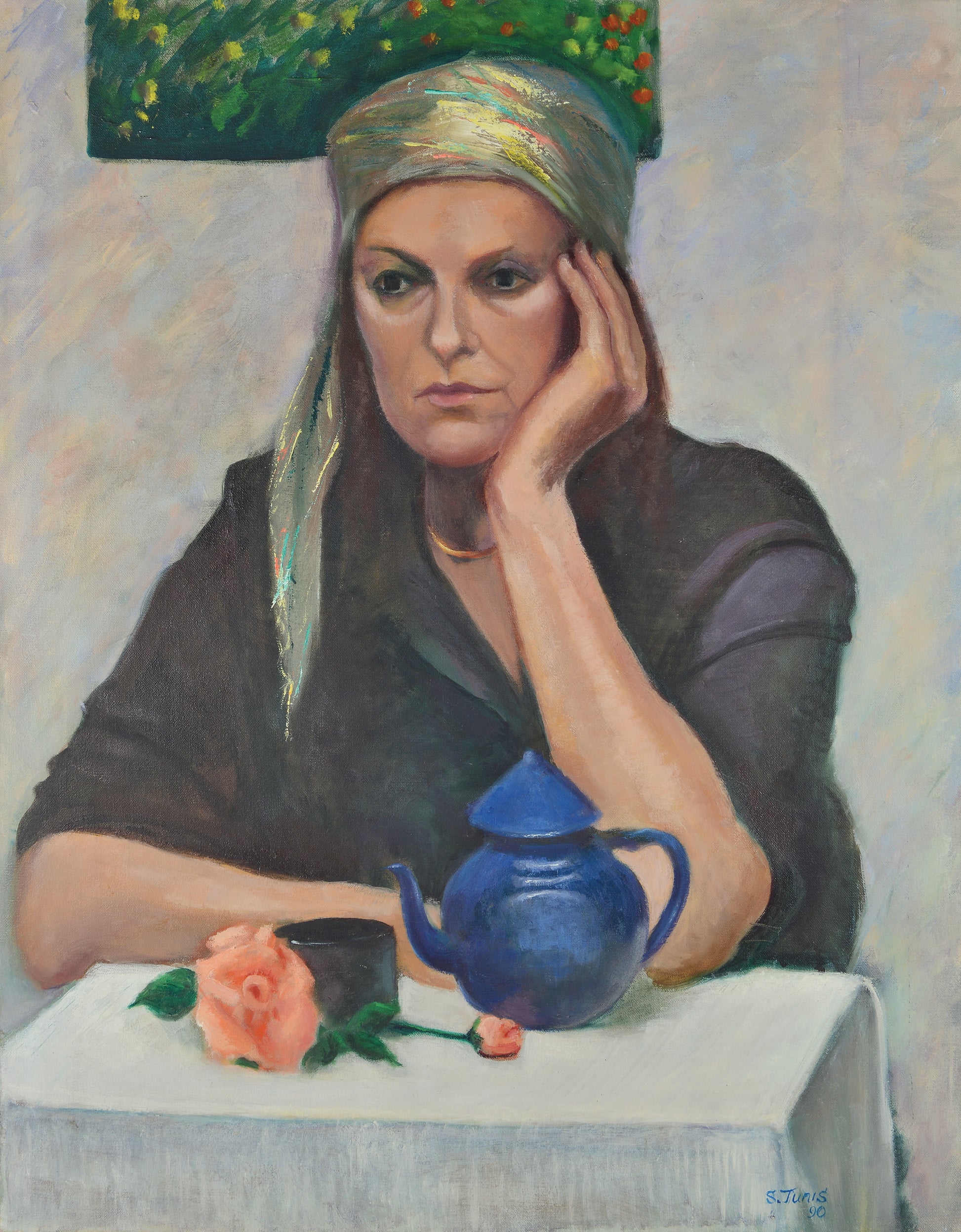 This is your 'great fortune' to attain such a work of art, this lovely painting with a thoughtful pose by a woman having tea. Done in 1990, this measures 24" x 30".