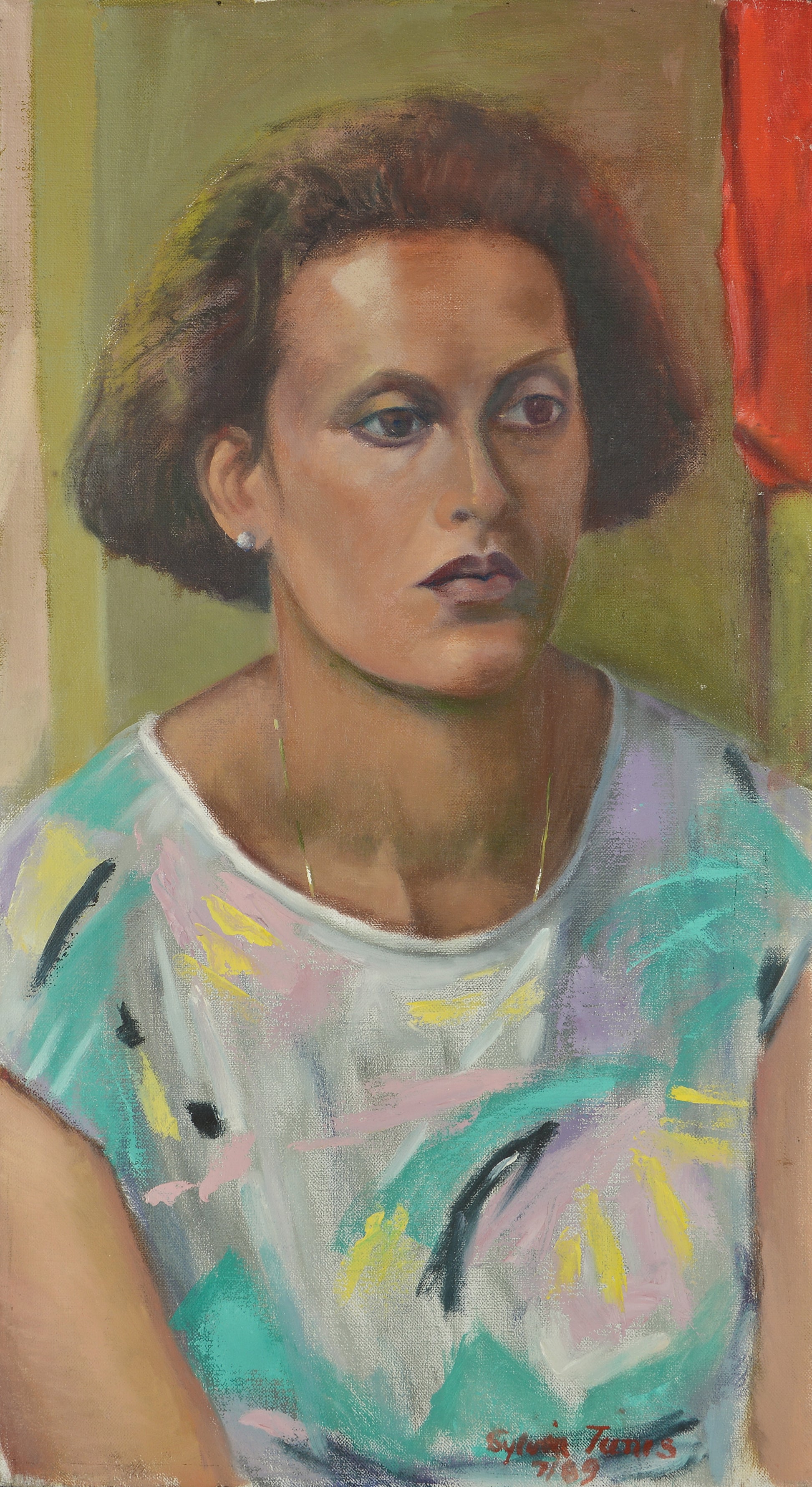 This sweet painting 22" x 12", painted in 1989, is of a woman in a printed shirt or dress looking casually ahead of her.