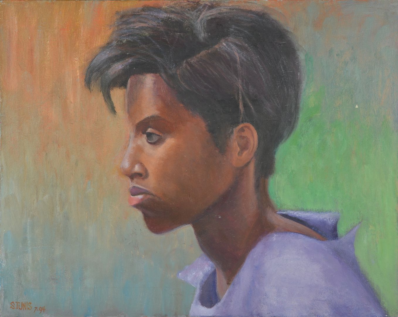 Pensive pose of young women in lavender captured in oil, painted in 1994. 16" x 20".